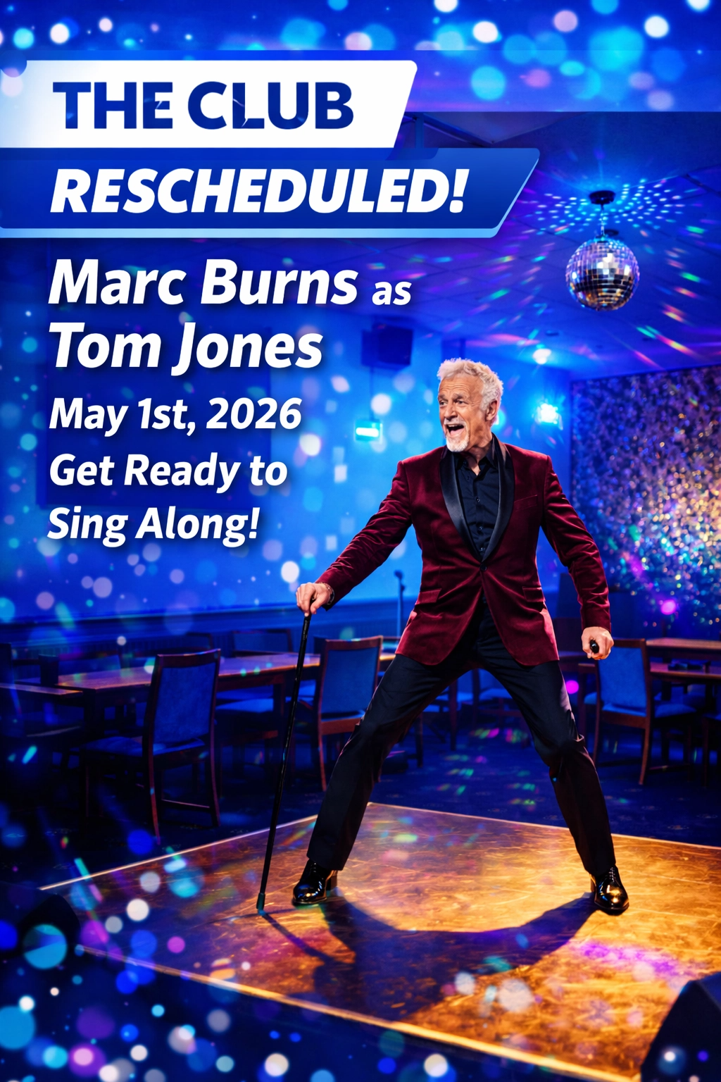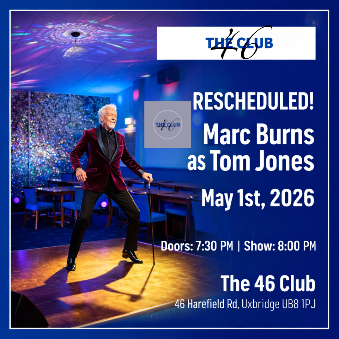 We are excited to announce that the Marc Burns as Tom Jones event has been rescheduled to 1st May 2026 at The 46 Club. Join us for an unforgettable night of entertainment and nostalgia